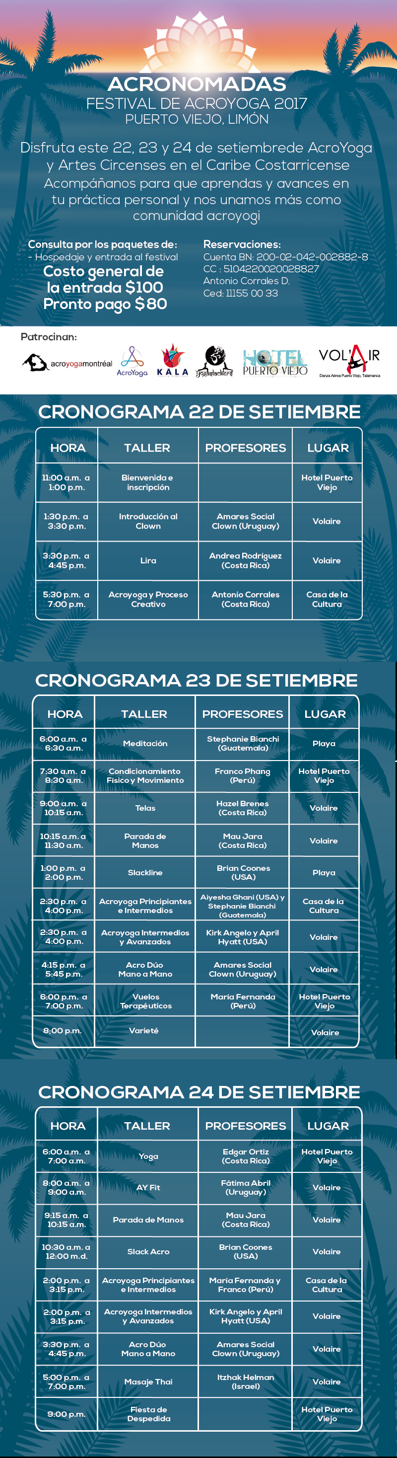 Este año nos veremos en Puerto Viejo, Costa Rica; tres días en el Caribe en que nos vamos a divertir muchísimo. Las clases se impartirán en el Hotel Puerto Viejo y en espacio Multicentro, con profesores de muchos países. ¡La última noche tendremos una fiesta de despedida!